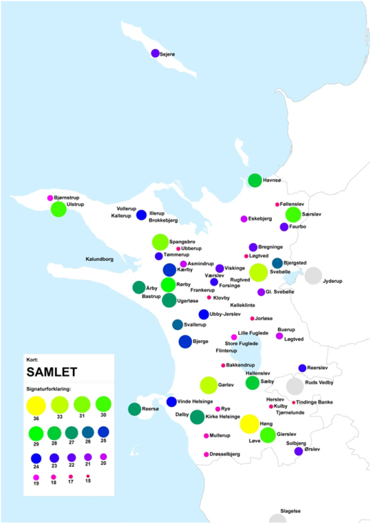 Kort 3.a. Illustration af summeret karaktergivning for de analyserede otte hovedparametre. Kalundborg by indgår ikke i analysen.