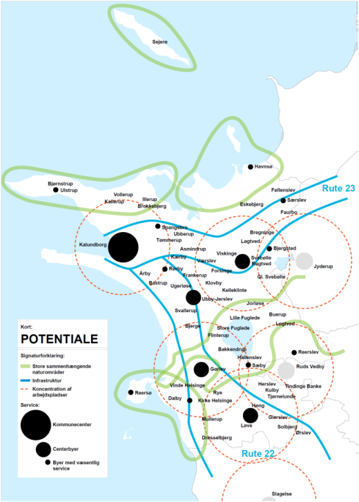Udviklingsmuligheder i landområderne er koblet til nærheden til Kalundborg og de større byer, hvor service og arbejdspladser er til stede. Samtidig spiller infrastruktur en væsentlig rolle for erhvervslokalisering samt for bosætning, hvor andre kvaliteter prioriteres højere end nærheden til arbejdsplads, fx natur og rekreative værdier.
