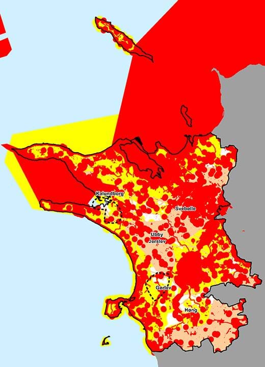 Kort 8.34.b Planmæssige bindinger for placering af større fælles biogasanlæg. Rød: restriktive zoner, orange: vurderingszoner anden myndighed, gul: vurderingszone kommunen.
