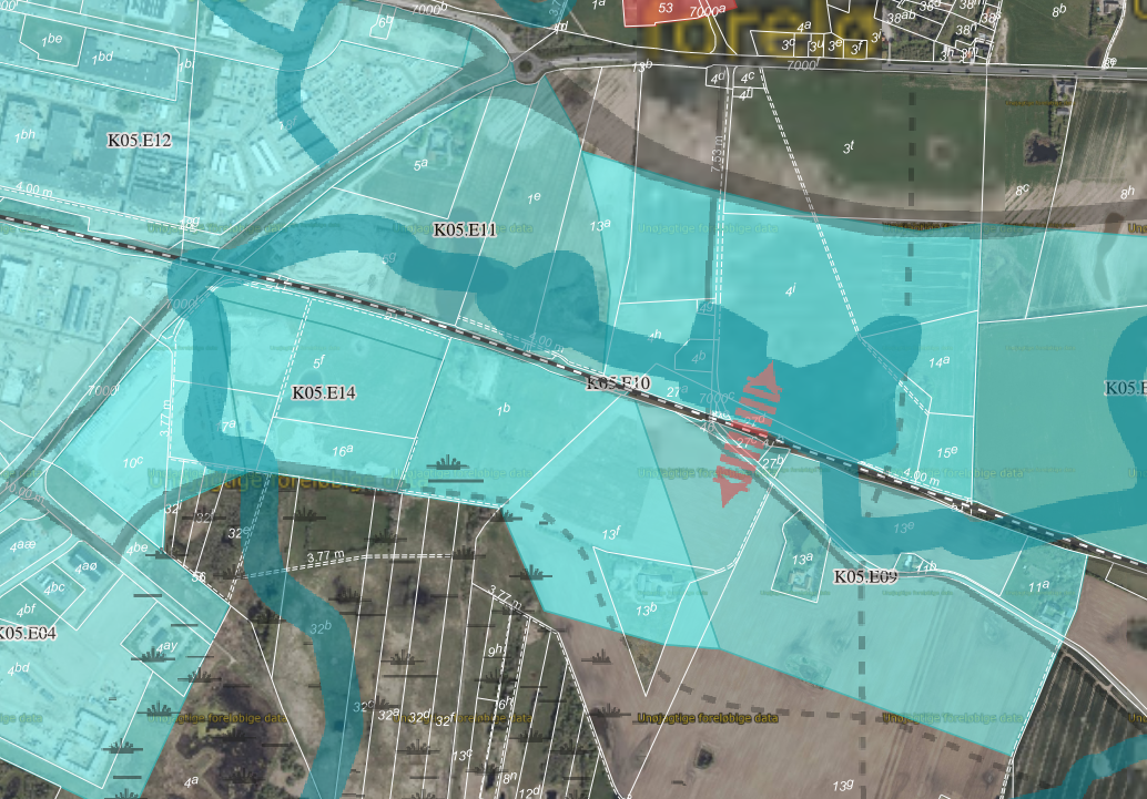 Figur 7c: Analysekort over den naturlige vandafstrømning i planområdet sammenholdt med eksisterende rammeområde K05.E09, K05.E10, K05.E11, K05.E13 og K05.E14.