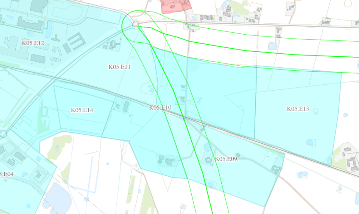 Området skal have tilkørsel fra det tilgrænsende erhvervsområde mod vest (K05.E10) og videre til erhvervsområdet ved Rendborgsparken (K05.E04) for at sikre adgang til den sydvestlige del af Kalundborg by. Evt. øvrig adgangsvej afklares i forbindelse med lokalplanlægningen. En mindre del af området indeholder jernbanetracé. Langs denne kan der gælde deklarationslinjer, som skal respekteres. |