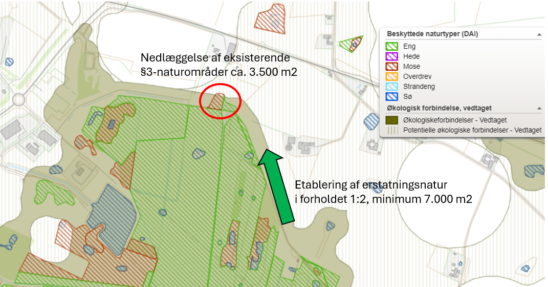 De to eksisterende NBL§3-områder er beliggende i den kommende forlængelse af den offentlige vej fra Rendsborgparken og vil i forbindelse med endelig vedtagelse af lokalplan 596 blive nedlagt. Der vil blive etableret et erstatningsareal syd for planområdet i umiddelbar nærhed af NBL§3-området i eksisterende økologiske forbindelse (figur 5a) i størrelsesforholdet 1:2, minimum 7.000 m2 i princippet som vist på figur 6a.