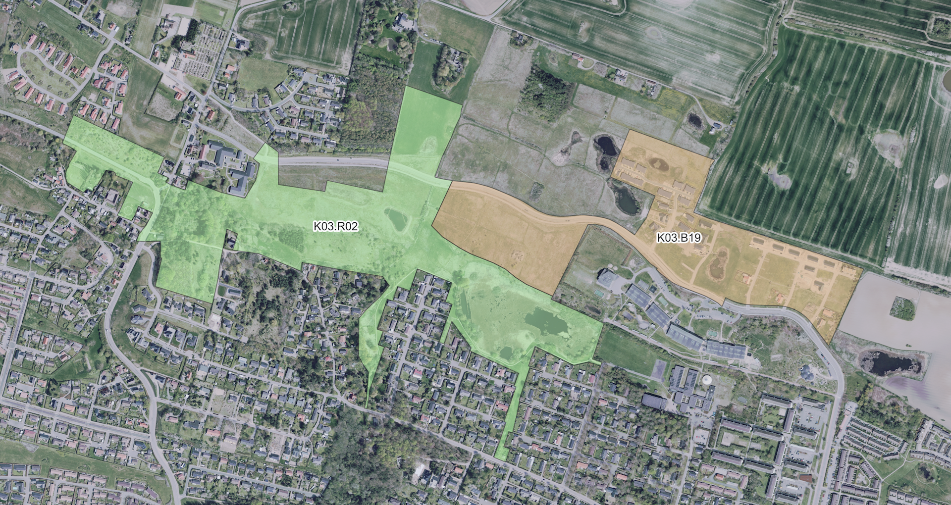- Udlægge et nyt rammeområde til blågrønne, rekreative formål, K03.R11, som erstatter dele af eksisterende rammeområder K03.B19 (boligområde) og K03.R02 (grønt, rekreativt område).