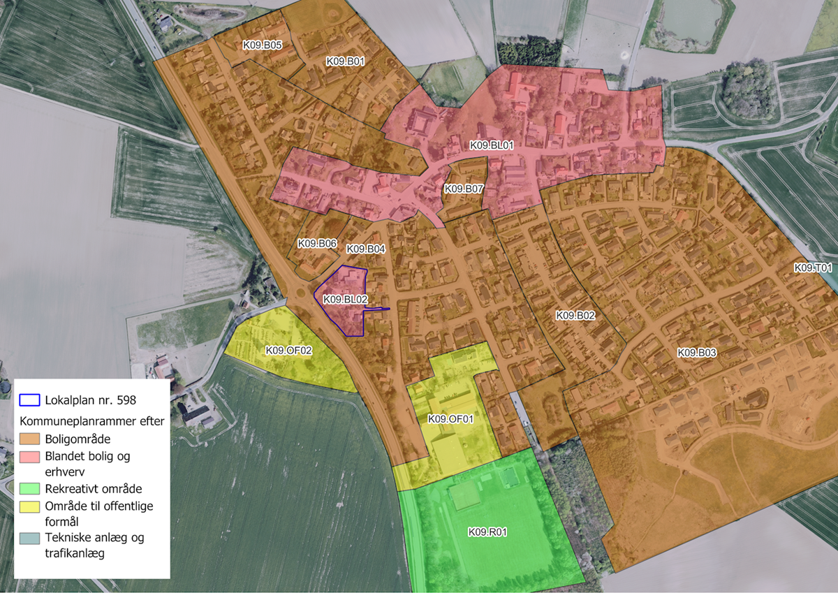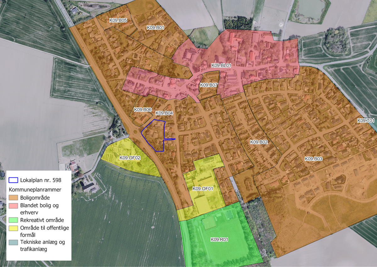 Dele af rammeområde K09.B04 erstattes af den nye kommuneplanramme K09.BL02 (blandet bolig og erhverv), og får således en ny anvendelse. Som konsekvens kan der etableres detailhandel herunder en enkeltstående butik inden for området. Afgrænsningen af det nye rammeområde ses af billede 2 i figuren herover.