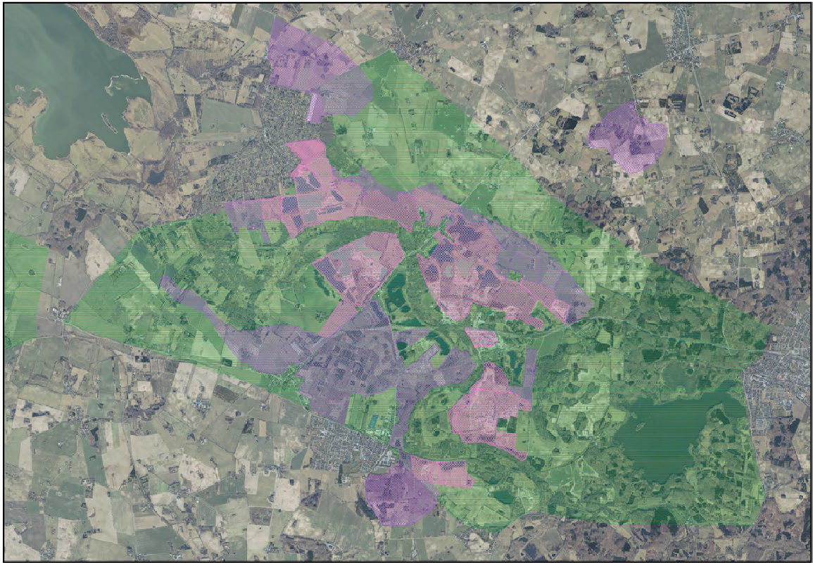 Figur 3 – Råstofområder (lilla) og geologisk interesseområde (grøn)